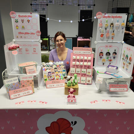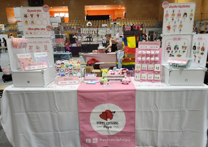 Hi! My name is Lara and I run PoppyCrossingDesigns. Since 2023 I have vendored at various anime and gaming conventions across Slovenia, Germany and the Netherlands.Here you can see a few examples of my table layout at some of my most recent conventions.